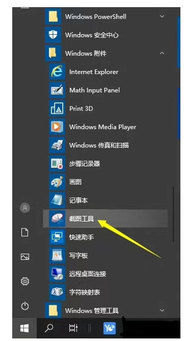 1、打开开始菜单,找到【windows附件】下的【截图工具】。
