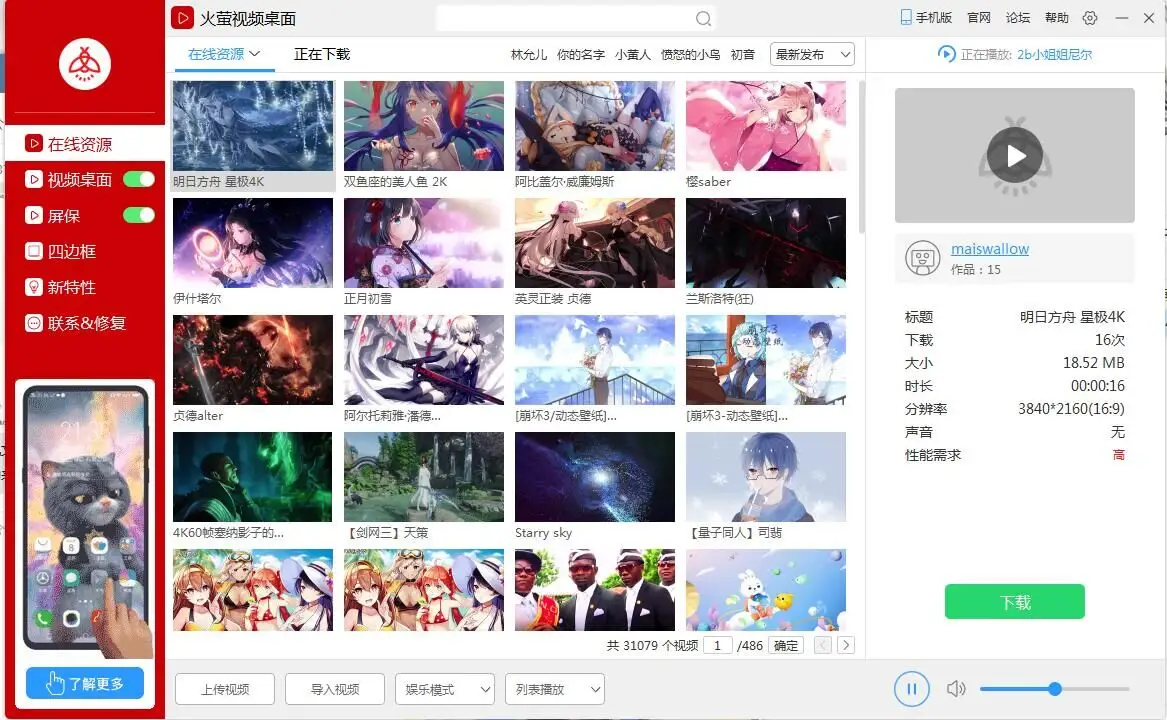 火萤桌面壁纸是一款提供视频动态桌面壁纸的电脑软件。用户可以使用该软件看到各色各样的好看视频,从而设置为自己的电脑壁纸,简单而又轻松。软件每天都会更新大量的壁纸,用户不需要担心找不到自己喜欢的内容。软件绿色免费,不占用系统多余内存。