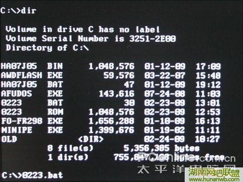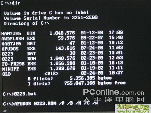 从文件列表中我们可以看到有一个名为0223的文件,后缀名为BAT,这是与这款主板的新BIOS相对应的文件,我们只需要输入0223.bat运行它,就可以完成刷新工作。