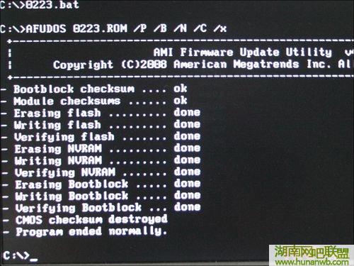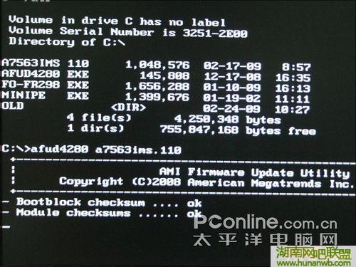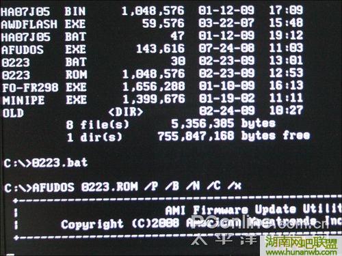 每个BIOS公司也都提供得有刷新BIOS的工具软件,只是使用起来没有这么方便而已。在提供批处理文件的压缩包中,其实就已经包括了一个官方的刷新工具,为了让用户更加方面,就提供了一个批处理文件,运行批处理文件后,批处理文件就会自动输入命令完成刷新过程。从下图中我们也可以看出来。