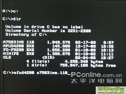 使用DOS系统中的命令:dir,就可以看到刷新工具的名字为AFUD4280.EXE,BIOS文件的名字为A7563IMS.110,于是我们只需要输入刷新工具的名字+空格+BIOS文件名称就可以了,如上图所示。