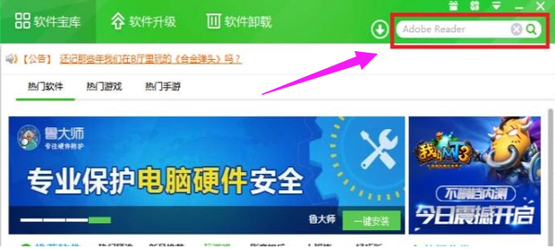 1.用电脑携带的软件管家下载Adobe Reader,打开搜索栏,输入“Adobe Reader”搜索。
