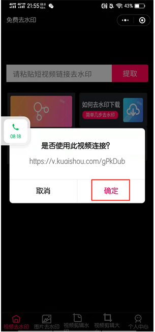 6、在视频去水印的界面中,输入复制好的链接点击确定。