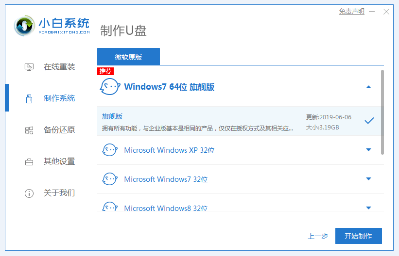 2、选择所需制作的系统,选定后点击下方的开始制作。