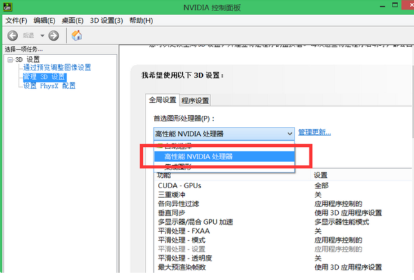 2、点击打开后,可以选择3D设置子菜单里的3D管理设置,在首选图形处理器上选择高性能NVIDIA处理器,也就是独显了,然后点击下面的保存就可以了。