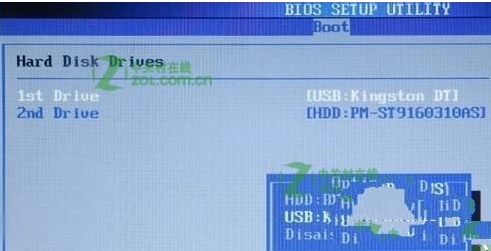 6、开机F2(不同电脑不一样,看说明)进入BIOS ———— 选择“Boot”菜单下的“Hard Disk Drives” ———— 将“1stDrive”设置为你的U盘 ———— 返回上一界面,选择“Boot Device Priority”。将“1st Boot Device”设置为你的U盘———— 按F10键保存设置并退出。(此步必须)