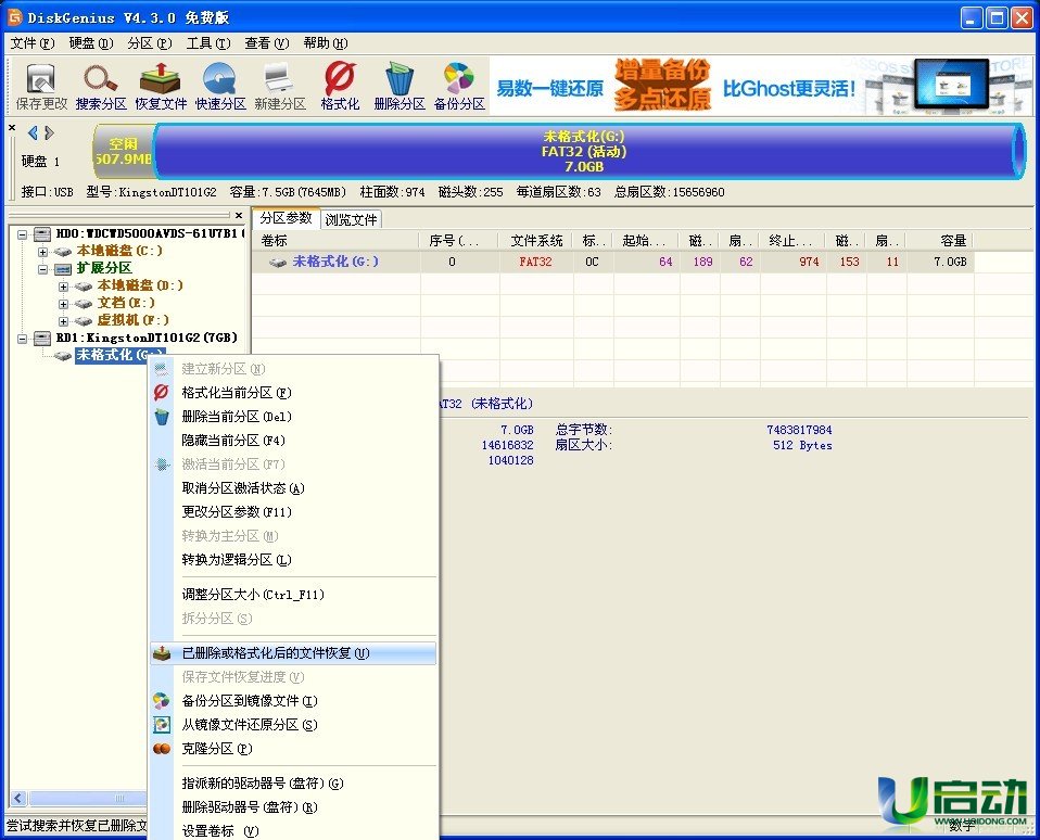 首先,将出问题的u盘插入到电脑的USB接口当中。随后双击打开DiskGenius,找到左边的列表图中,找到我们所插入的u盘,之后点击鼠标右键,找到“已删除或格式化后的文件恢复”,如下图