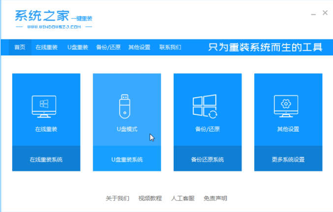 1、首先退出杀毒软件,然后打开[系统之家重装],然后选择[U盘模式]。