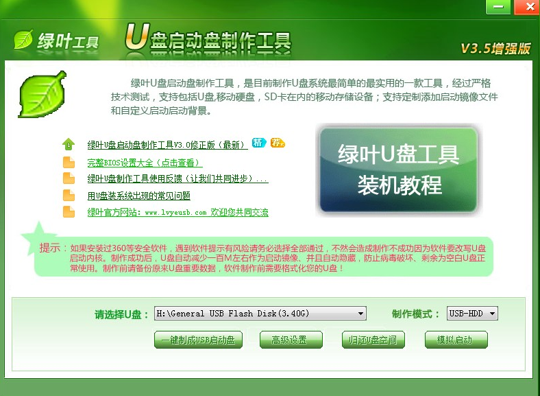 1、目前绿叶启动盘制作软件版本为 3.5,大家可以到网站中下载最新版本即可。打开之后插上 U 盘就可以直接进行制作。