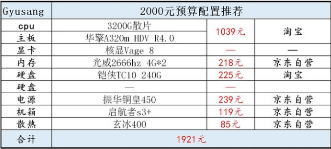 由于目前显卡暴涨,导致核显CPU目前也有小幅的增长,3200G和3400G这些APU相比上个月也贵了百来块钱,预算还可以加一点可以上3400G,核显性能更强,不过3200G玩个腾讯全家桶,满足日常办公需求也是没问题的。