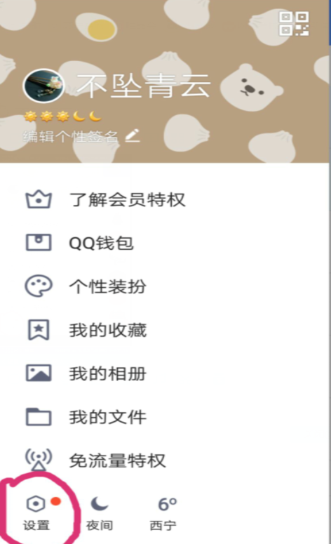 2、用手指在QQ主页面上往右滑一下,就会出现一些基本内容,最底下找到“设置”,点击进入。