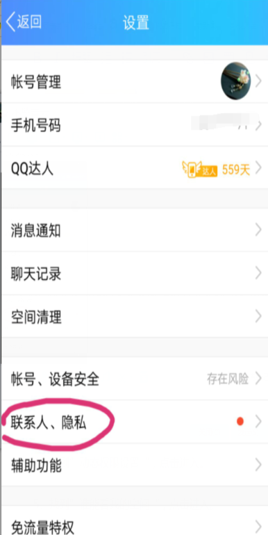3、设置里找到“联系人、隐私“,点击进入。