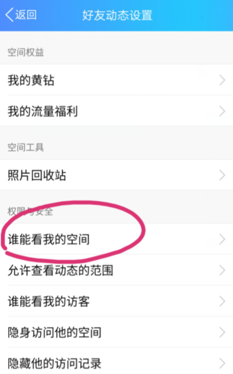 5、里面权限与安全下方第一条是”谁能看我的空间“,点击进入。