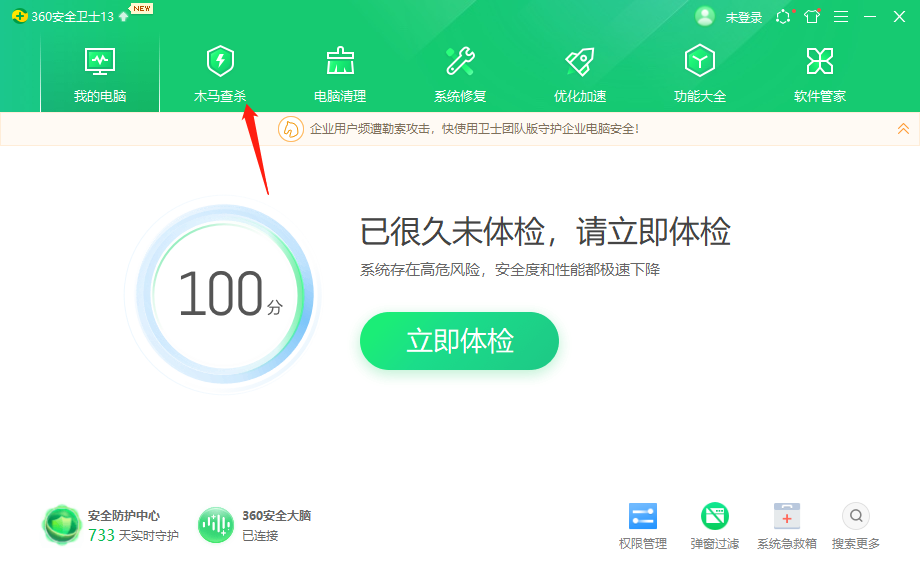 1、打开360安全卫士之后我们在上方点击木马查杀选项,如图所示。