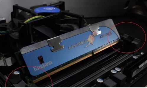 2、竖直插入内存槽,两侧稍微用力(不要蛮力),当你听到两声清脆的卡塔声就说明你已经正确插入内存了,同时你也可以看到扣锁咬住了内存的口。