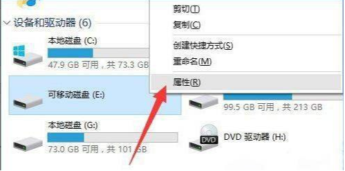 1、插入u盘,打开我的电脑,右击U盘盘符,在弹出的右键菜单中选择“属性”。