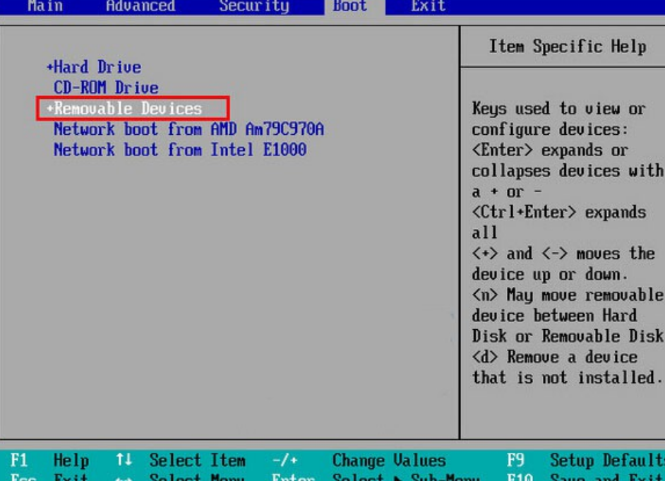 3、“removeble device”移动到哪呢?就是把它移动到最上层,然后设置启动U盘