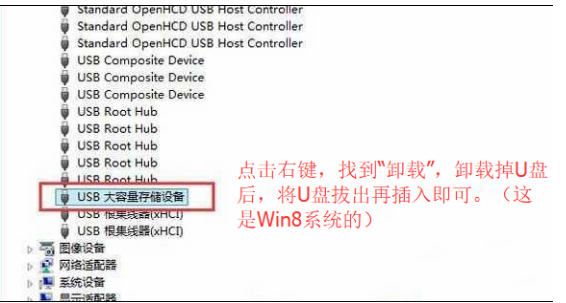 4、随后找到usb大容量存储设备,右击它选择卸载;