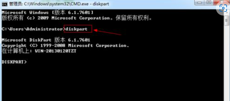 2、在命令行输入diskpart,启动diskpart程序