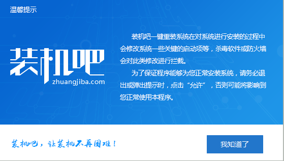 2、 打开装机吧一键重装系统软件,出现温馨提示,关闭所有的杀毒软件,点击我知道了