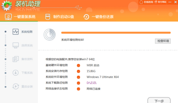 1.首先下载安装装机助理一键重装系统工具并打开,程序会默认检测当前系统环境,检测完成后,点击“下一步”。