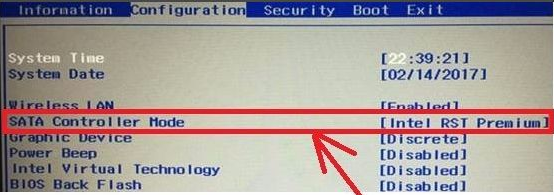 1.按下启动键,然后不断点击BIOS启动热键。主板按钮不一样。通常会显示在启动品牌logo界面下方。您也可以尝试F2.F12.ESC.Del这些按钮进入BIOS。通过向左和向BIOS切换到configuration(PC配置项目),查找SATAControllerMode(硬盘模式)。