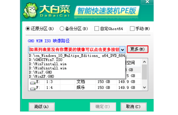 1、打开大白菜pe一键装机软件,点击更多搜索镜像。